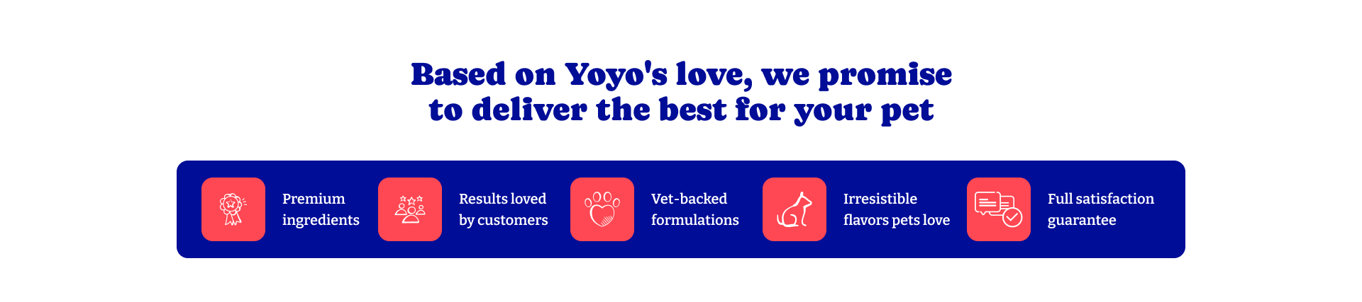 2023年、 YoYoBayが誕生しました。YoYoBayは、すべてのペットに科学的根拠に基づいた専門的なケアを提供することに専念しています。YoYoBayは残念ながら2024年に亡くなりましたが、彼女のレガシーは今もチームと私たちの使命にインスピレーションを与え続けています。ルビー、ダニー、モカといった新しい仲間たちも加わり、私たちはYoYoBayの精神を受け継ぎ、すべてのペットの健康と喜びに満ちた生活を送れるよう尽力しています。YoYoBayは、ペットにとって生涯にわたる健康の安息の地であり、愛と友情が永遠に続く場所です。