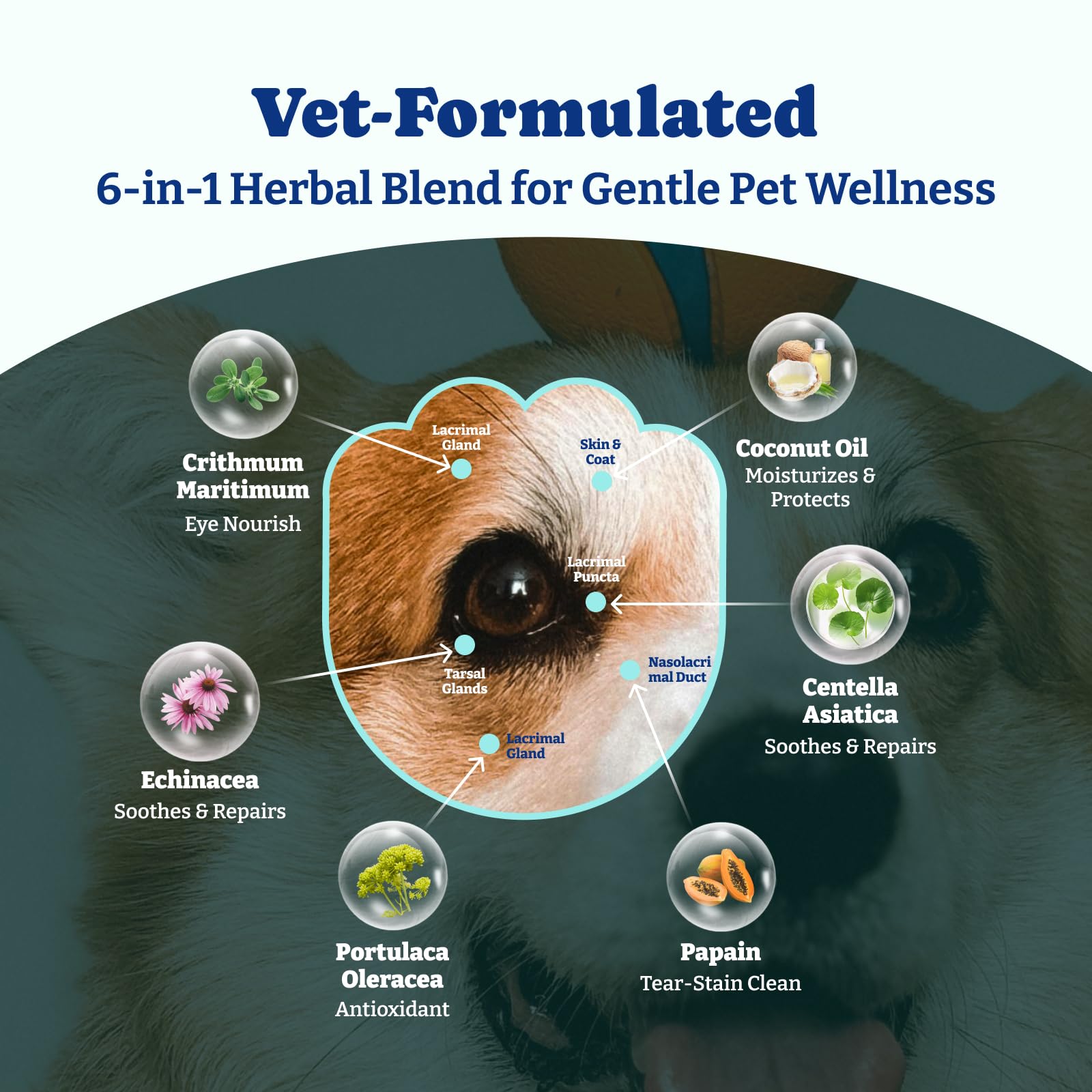 - 獣医承認の処方: 独自の 6 in 1 ハーブ コンプレックス (ツボクサ、エキナセア、パパイン、スベリヒユ、ココナッツ オイル、クリスマム マリチマム) を配合し、炎症を鎮め、目の周りを明るくし、敏感な目を保護します。