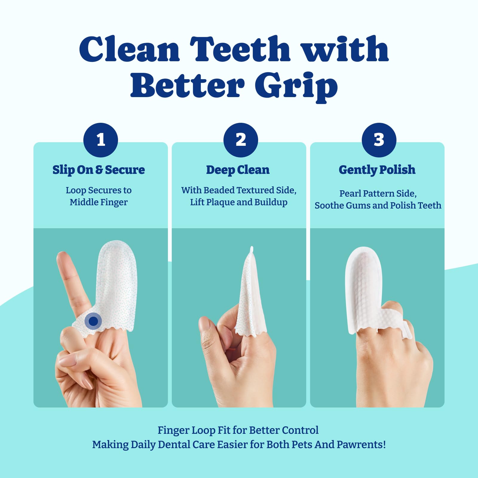 - しっかりフィットする指用ワイプ: ペット用デンタルワイプは、しっかりとフィットして所定の位置に留まる安全な指用ループを備えた設計で、滑りを防ぎ、従来の犬用デンタルワイプよりも優れたグリップ、コントロール、および到達性を提供します。