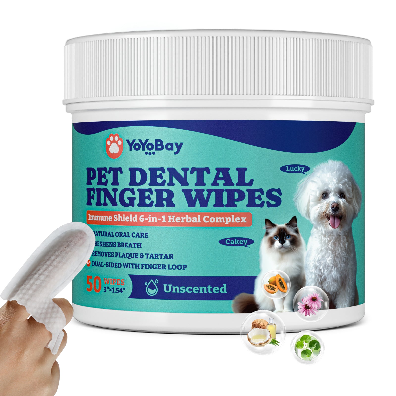 - 両面犬用デンタルワイプ: 犬と猫用のこの指用デンタルワイプは、歯垢や食べかすを取り除くビーズ状の面と、歯と歯茎をやさしく磨く滑らかな面が特徴で、毎回拭くだけで効果的な洗浄効果が得られます。