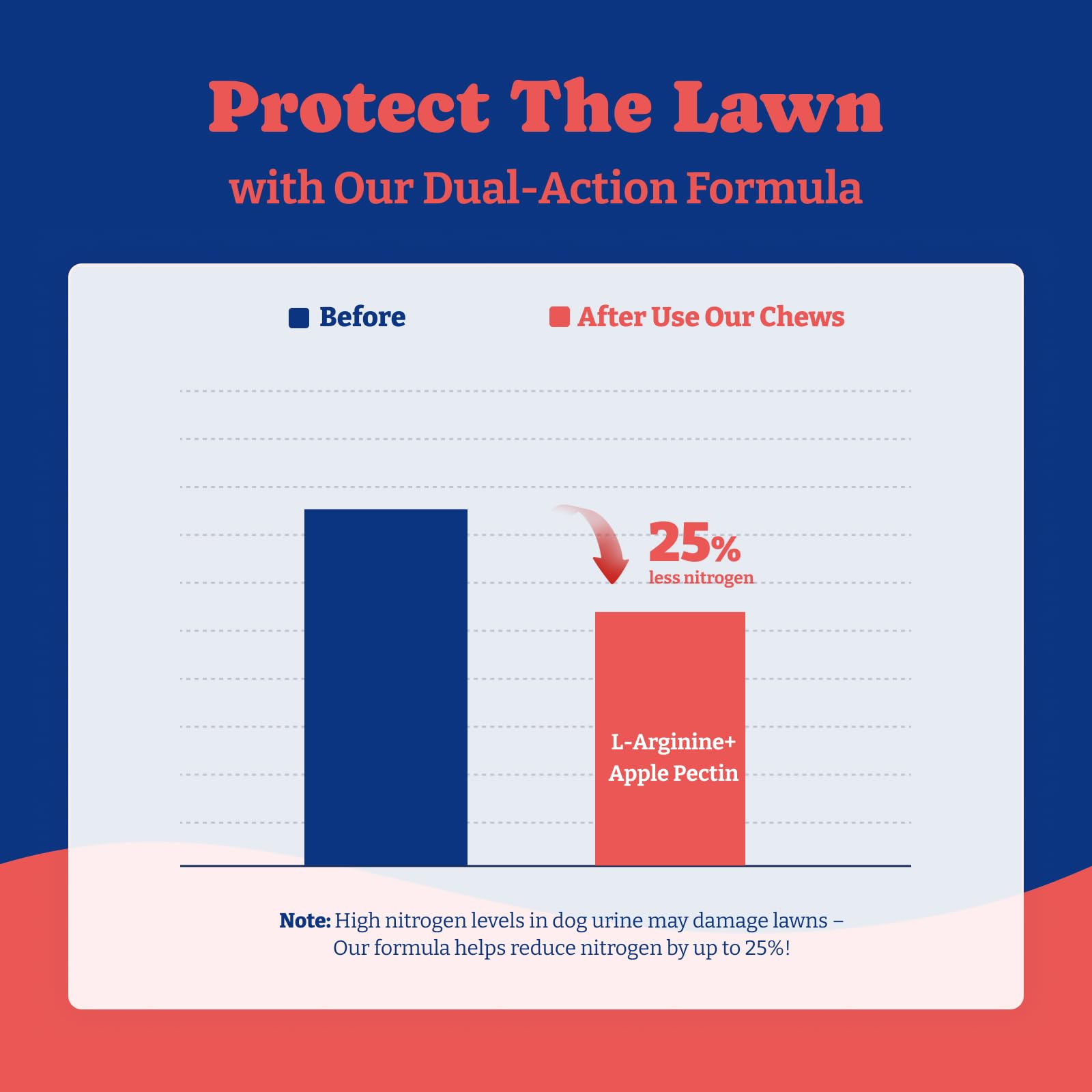 - 芝生の健康維持をサポート:犬の尿に含まれる窒素濃度が高いと、芝生に黄色い斑点が現れることがあります。L-アルギニンとアップルペクチンを配合した当社の芝生焼け防止チューは、窒素濃度を最大25%低減するよう設計されています。また、芝生を緑豊かに保つ犬用チューは、芝生を緑豊かに保ちます。犬の尿対策用グラスセーバーは、愛犬の健康と芝生の緑を保ちます。