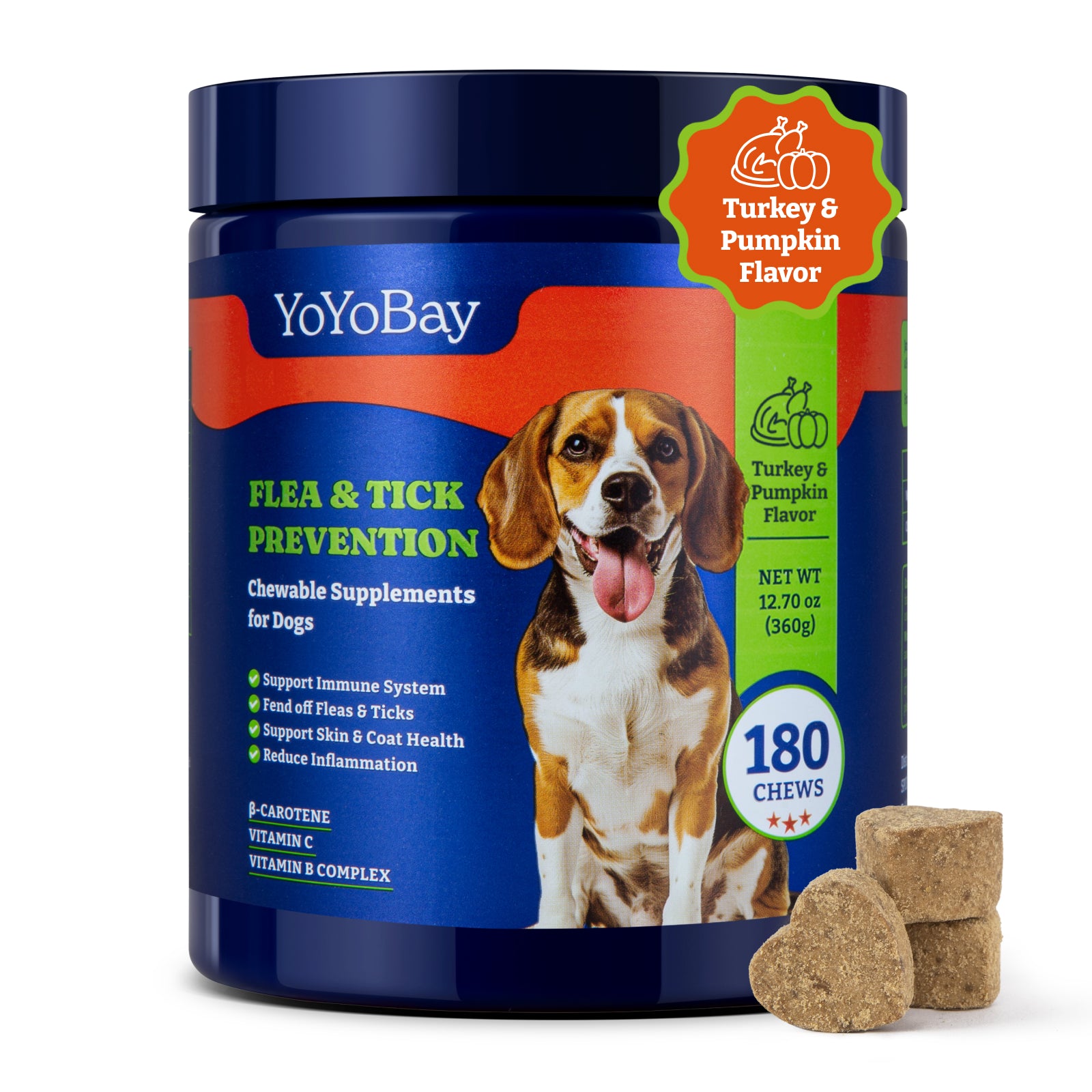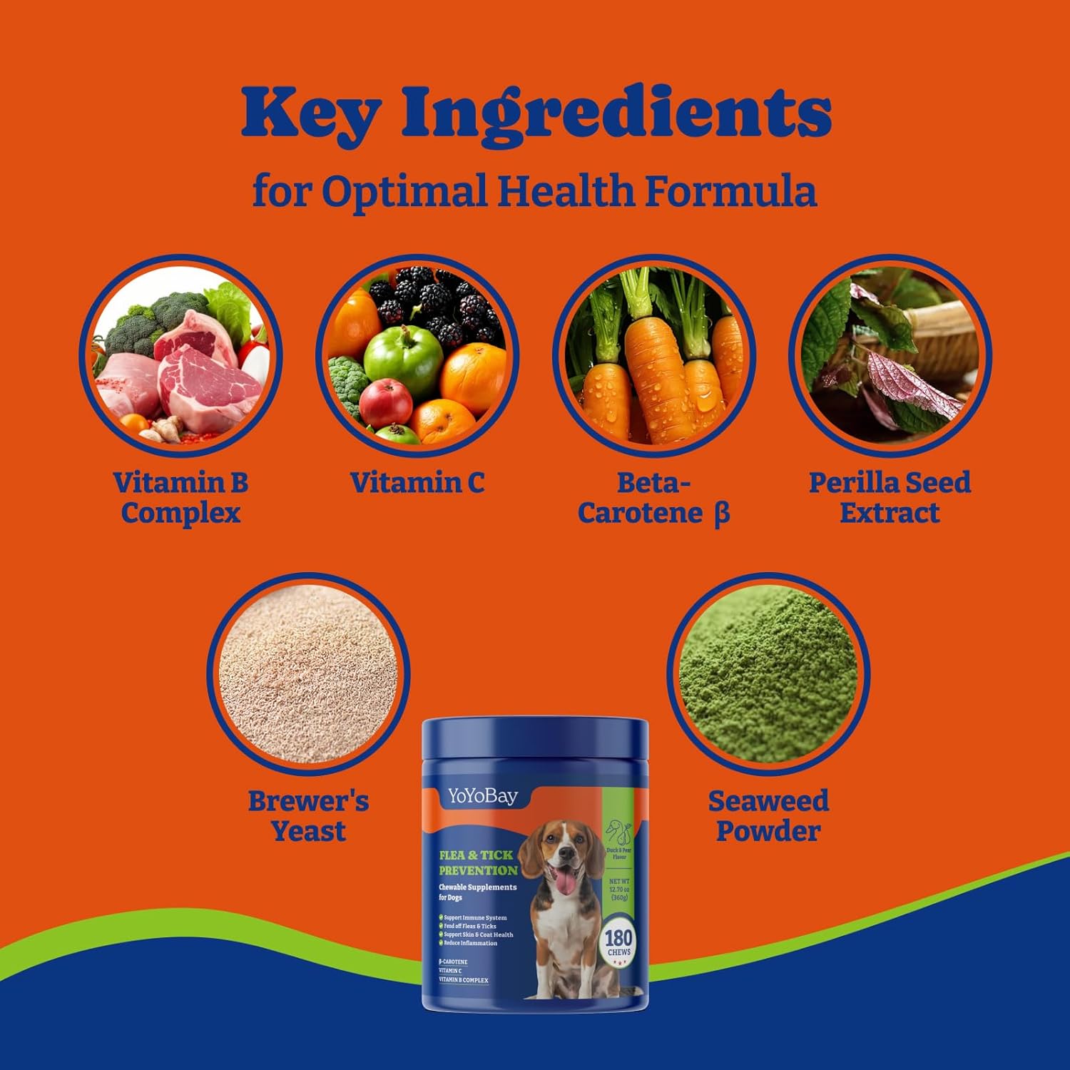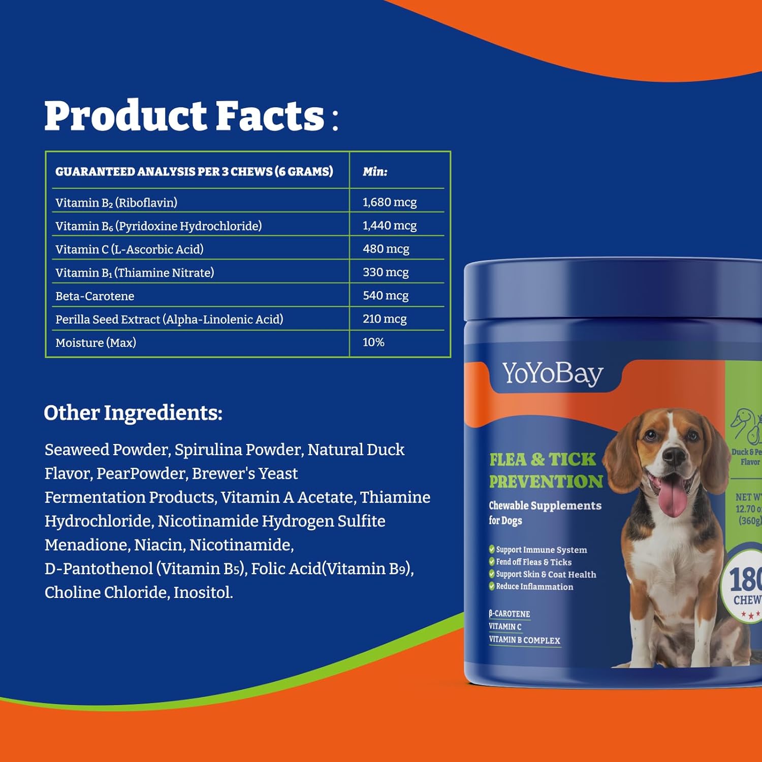 - 天然のノミ・ダニ予防で長期保護:ベータカロチン、シソ種子エキス、ビール酵母を配合したこのチューは、ノミやダニを自然に予防するとともに、B2、B6、Cなどの必須ビタミンで犬の免疫システムを強化します。完全な予防計画の一部として使用するのが最適です。