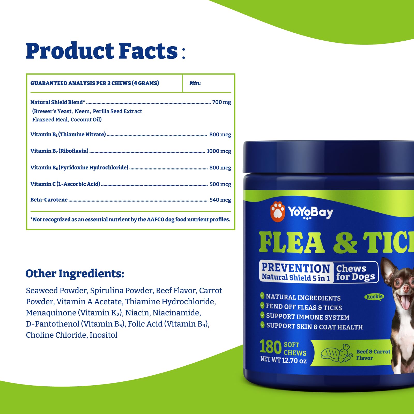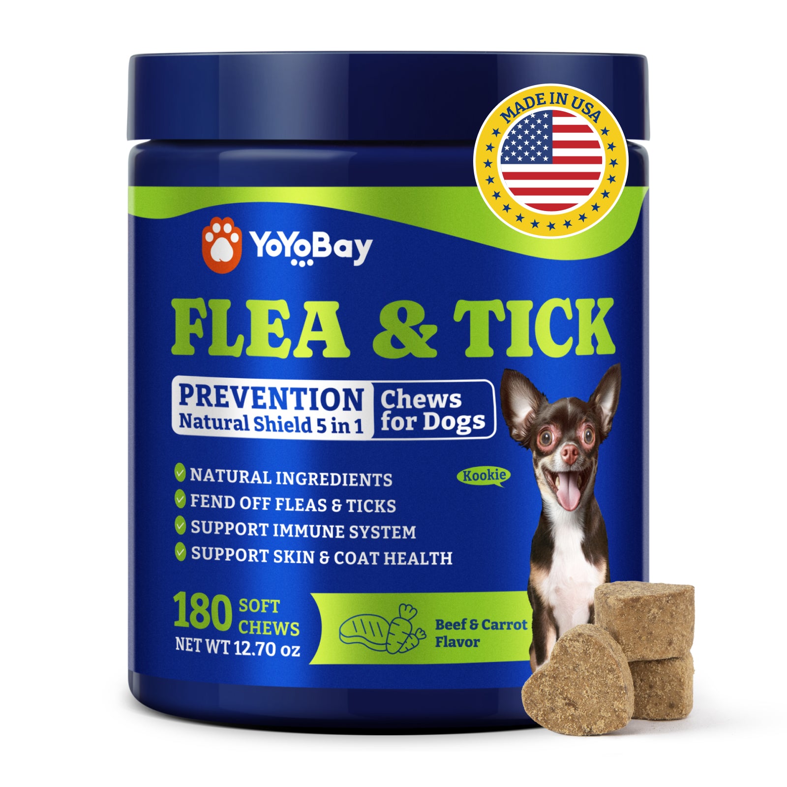- ナチュラルシールド 5-in-1 保護: ビール酵母、ニーム、シソ種子エキス、亜麻仁粉、ココナッツ オイルを配合した YoYoBay ノミ・ダニ予防チュアブルは、ノミやダニを自然に予防しながら、全体的な健康をサポートします。