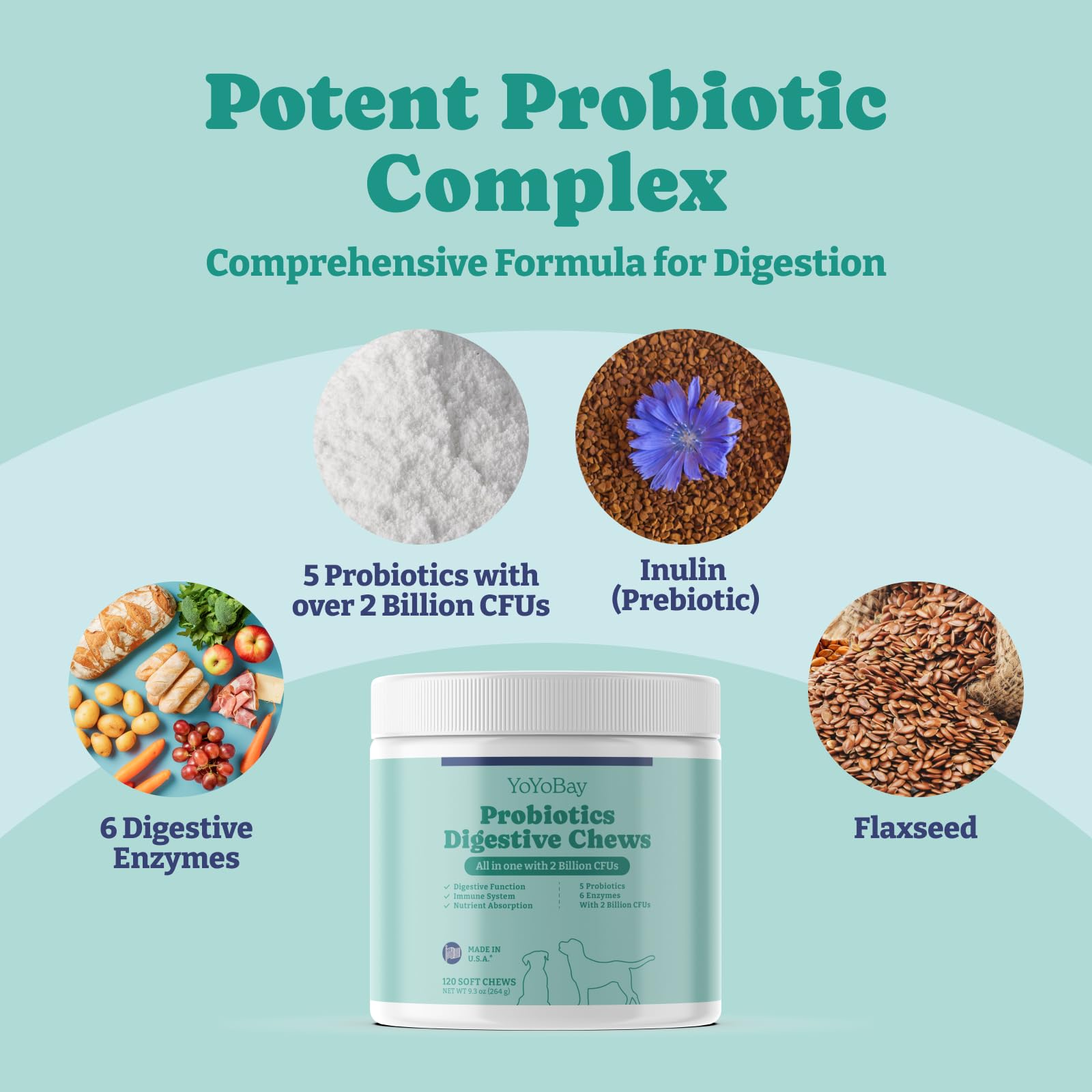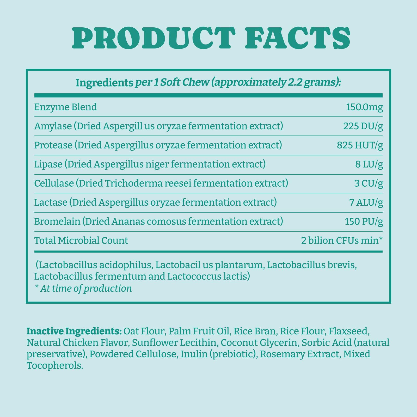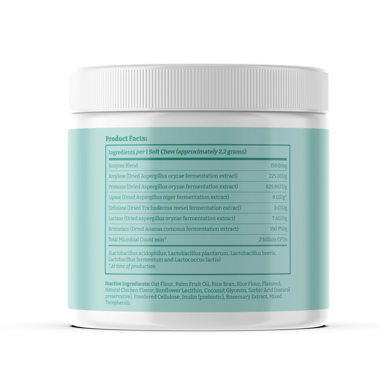 - 強力な酵素とプロバイオティクスのブレンド – この強力なフォーミュラは、アミラーゼやブロメラインを含む5種類の主要な消化酵素と、20億CFU以上の乳酸菌プロバイオティクスを配合しています。これらが相乗効果を発揮し、栄養素の分解と吸収を促進し、腸内環境のバランスを整え、酵母菌のバランスを整え、愛犬の消化器系の健康状態を全体的に改善します。