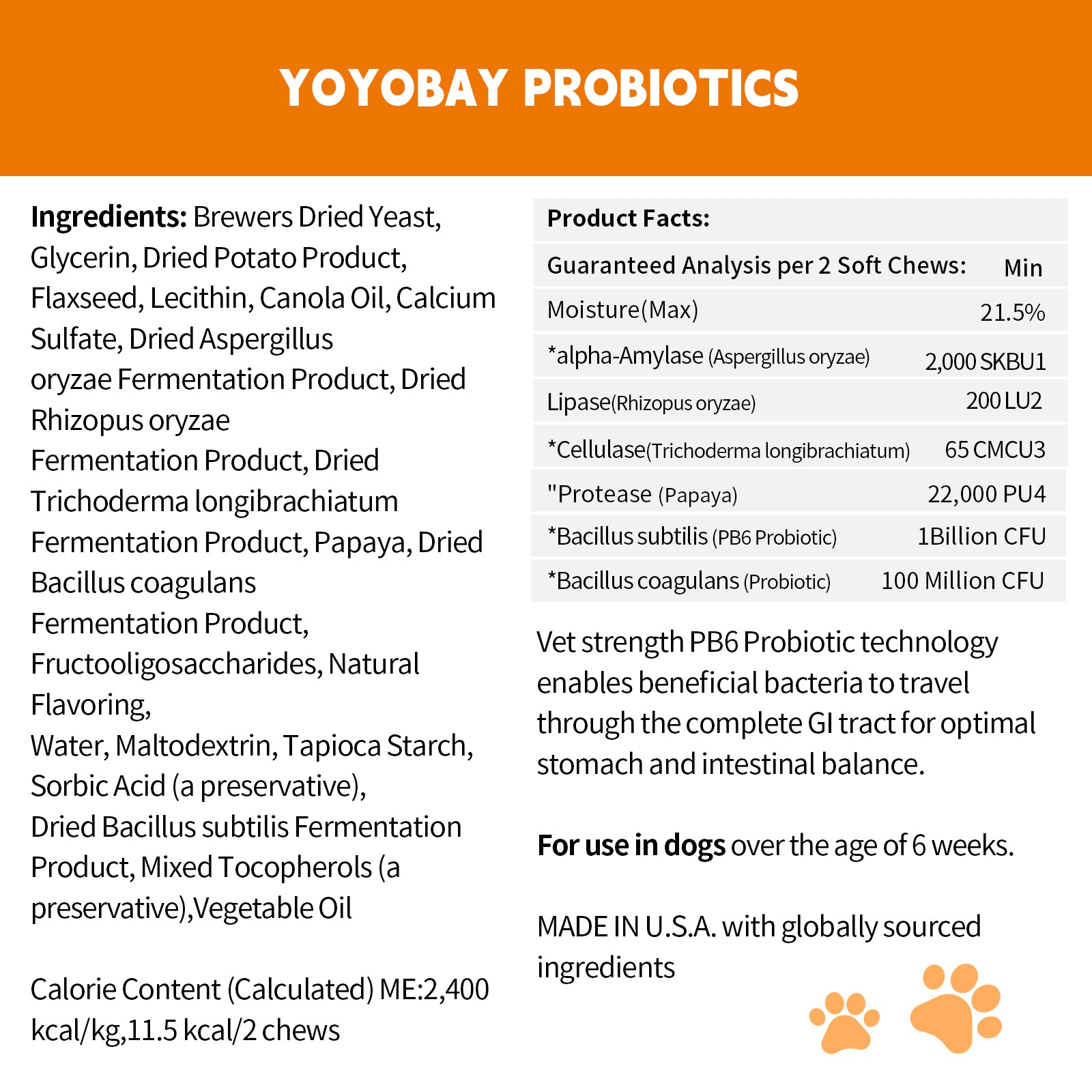 - 包括的な消化サポート – このフォーミュラは、4種類の強力な消化酵素(α-アミラーゼ、リパーゼ、セルラーゼ、プロテアーゼ)と、バチルス・サブチリスやバチルス・コアグランスを含む11億CFU以上の有益なプロバイオティクスを配合しています。これらの成分が相乗効果を発揮し、栄養素の吸収を高め、腸内細菌叢のバランスを整え、酵母菌のバランスを整え、強力な免疫システムを強化します。